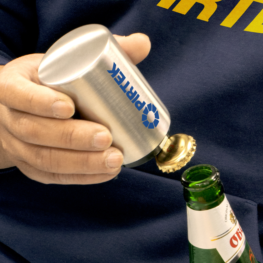 Handy stainless steel automatic bottle opener which makes opening soda, beer and cider bottles a breeze. Simply place the opener over the bottle and press down to release the bottlecap.