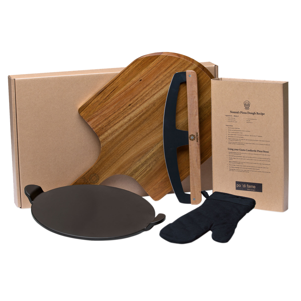 Set includes: Pizza Stone, Peel, cutter and oven mitt